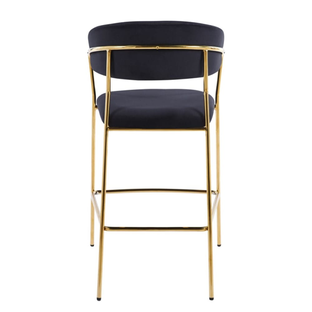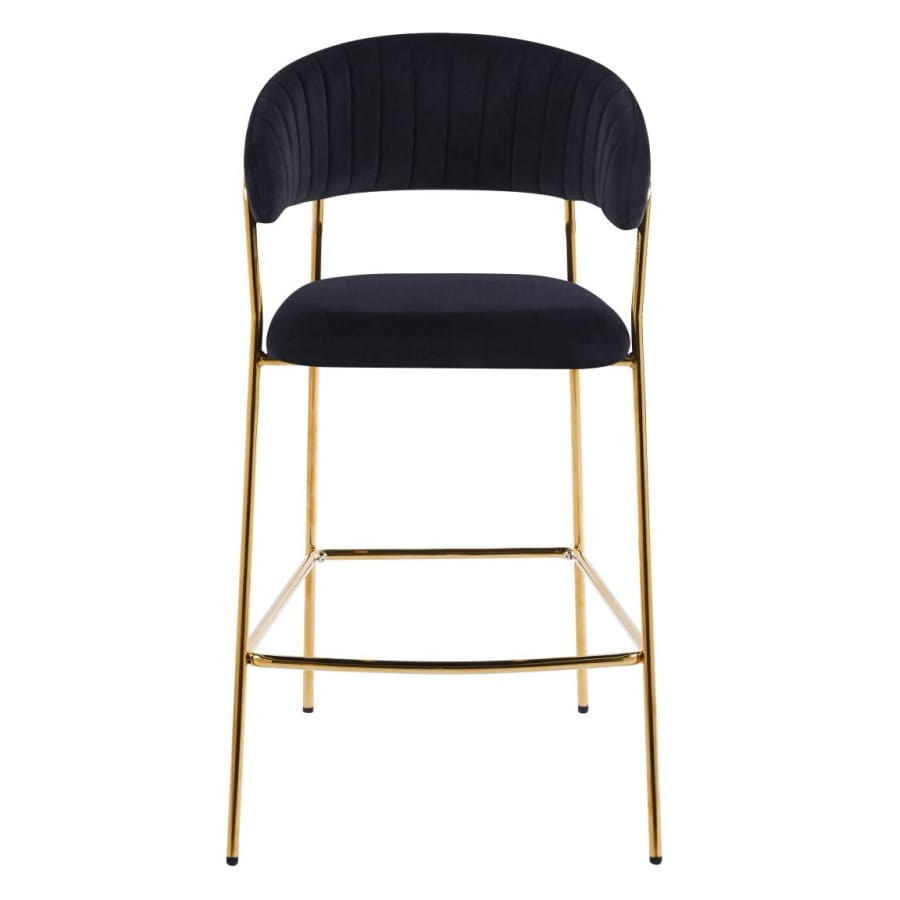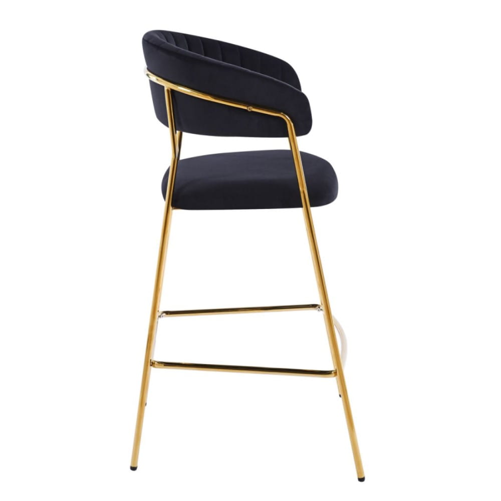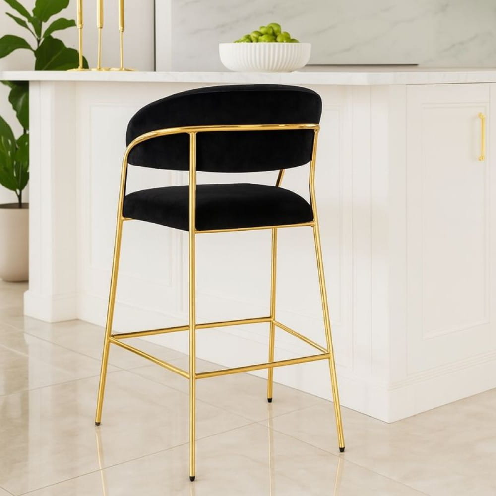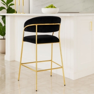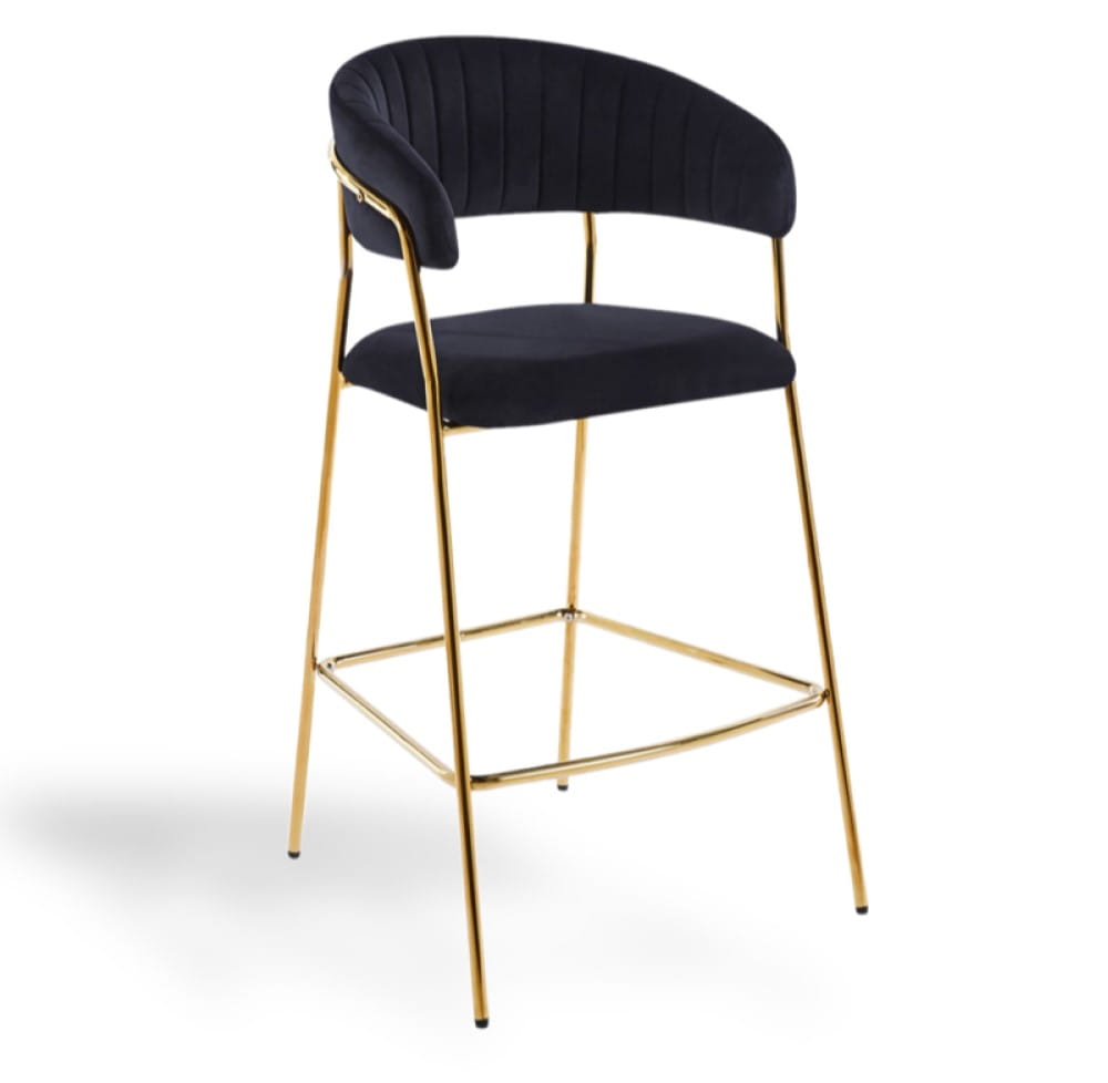 Hoker LAYLA to elegancki, niski hoker z siedziskiem na wysokości 66 cm, idealny do wysp kuchennych o wysokości 90 cm. Miękka tapicerka z czarnego velvetu oraz smukłe, złote chromowane nogi nadają mu wyrafinowany, glamour charakter.