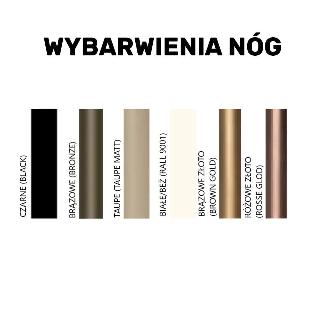 - Personalizacja podstawy — kolory nóg: czarne, białe, taupe, brązowe, złoto różowe, złoto brązowe.