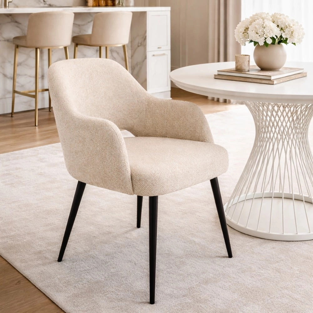 Krzesło KIRA Comfort M to połączenie wygody i nowoczesnej formy. Miękkie siedzisko na pasach tapicerskich oraz ergonomiczne podłokietniki sprawiają, że to krzesło komfortowe do jadalni, idealne do codziennego użytkowania. Model dostępny w tkaninie Dream (16 kolorów) z czarną metalową podstawą, która nadaje całości nowoczesny charakter. Wybierz kolor, zamów próbki i dopasuj krzesło do swojego wnętrza.