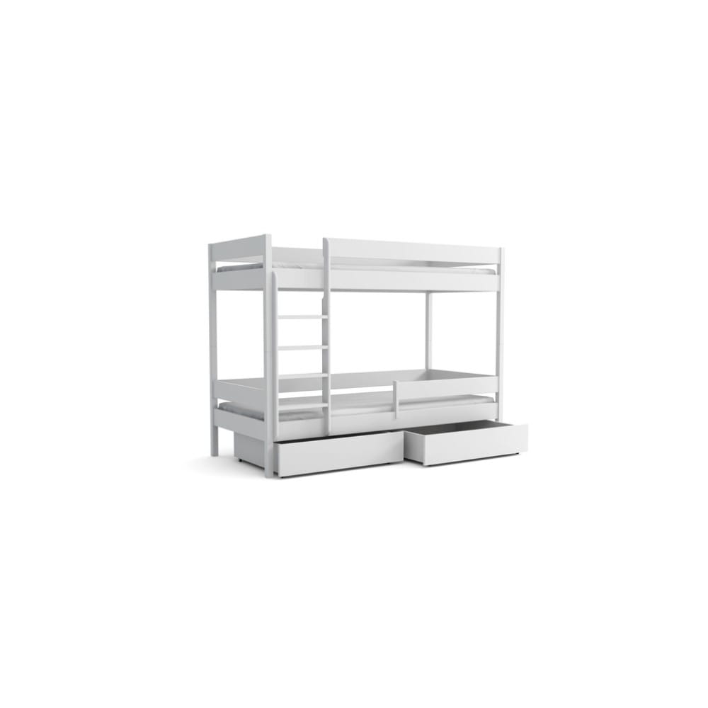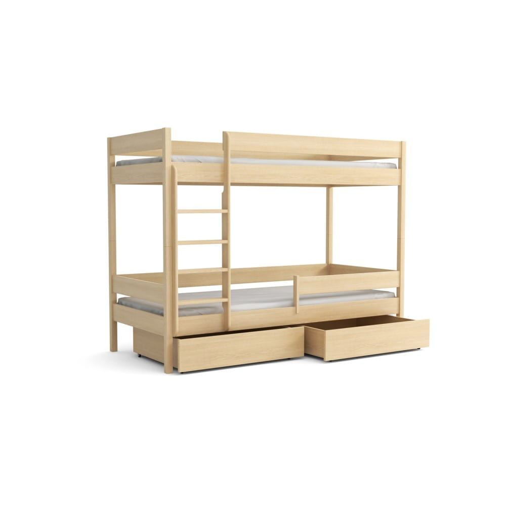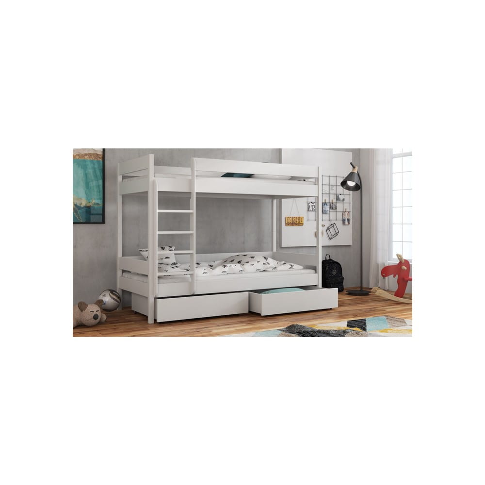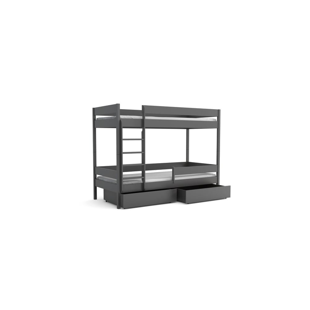 Wykonanie: ramy łóżka są malowane trzema warstwami bezpiecznych lakierów wodnych, co zwiększa odporność na zarysowania i odpryski. Stelaże z listew sprężynujących zapewniają komfortowy sen i trwałość konstrukcji. Szuflady w kolorze łóżka, wysuwane na kółkach, wykonane z laminowanej płyty wiórowej z zabezpieczonymi krawędziami PVC. Możliwość rozłożenia łóżka na dwa oddzielne, co czyni je wyjątkowo uniwersalnym rozwiązaniem na lata.