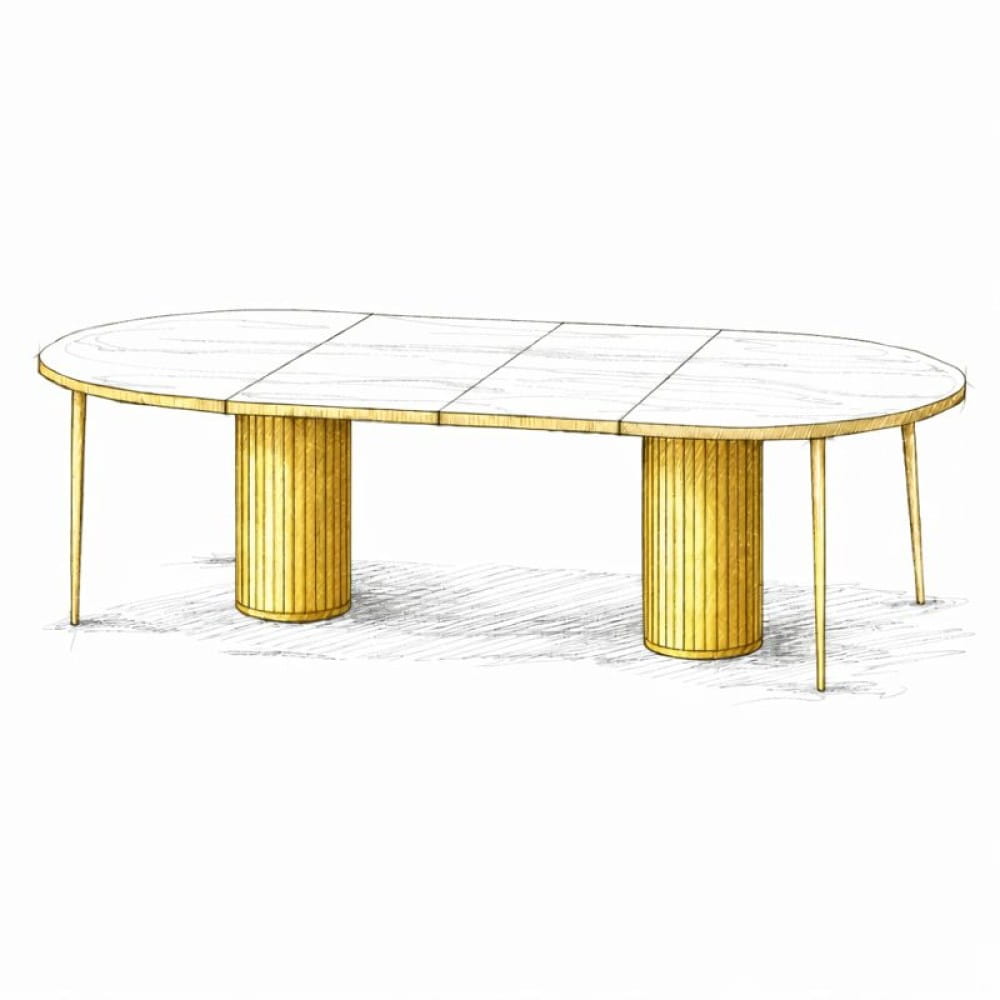 DIONE OVAL to elegancki, rozkładany stół glamour, zaprojektowany z myślą o przestronnych jadalniach i wnętrzach premium. Owalny blat, ryflowane metalowe nogi w złotym połysku oraz możliwość rozbudowy nawet do ok. 420 cm sprawiają, że jest to model wyjątkowo funkcjonalny i reprezentacyjny.