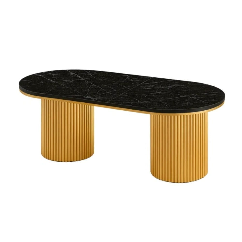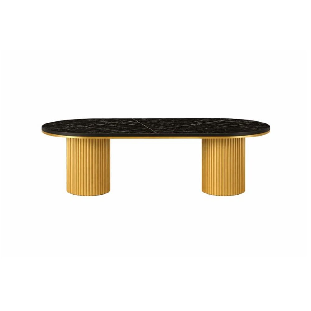 Stół DIONE OVAL to luksusowy stół glamour z owalnym blatem imitującym czarny marmur oraz ryflowaną złotą podstawą w połysku. Model rozkładany, produkowany w Polsce na zamówienie, z możliwością konfiguracji aż do 420 cm długości. Idealne połączenie: stół glamour + krzesła tapicerowane velvet lub boucle.
