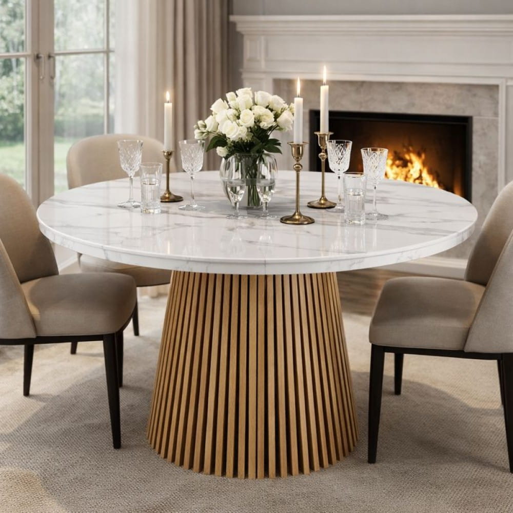 VALENTI 120 to elegancki okrągły stół rozkładany z jasnym blatem imitującym biały marmur oraz dekoracyjną, ryflowaną podstawą w kolorze dębu. Subtelne użylenie blatu dodaje całości luksusowego charakteru, idealnego do wnętrz modern classic i classic wood. Funkcja rozkładania pozwala dopasować stół do codziennych posiłków i większych spotkań rodzinnych. polska produkcja • rozkładany • jasna jadalnia premium