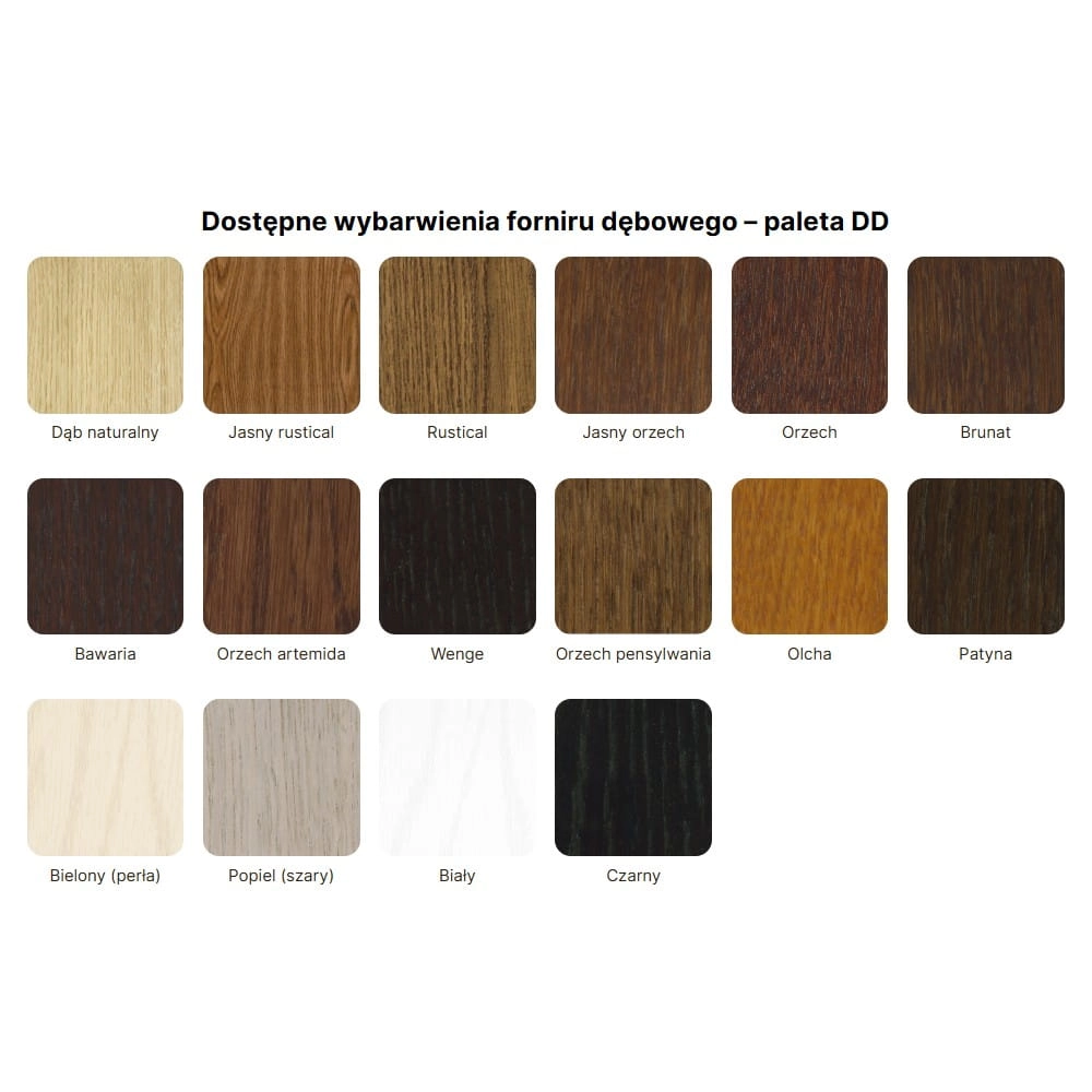 Blat dostępny jest w różnych wybarwieniach forniru dębowego – od jasnych po głębokie odcienie.