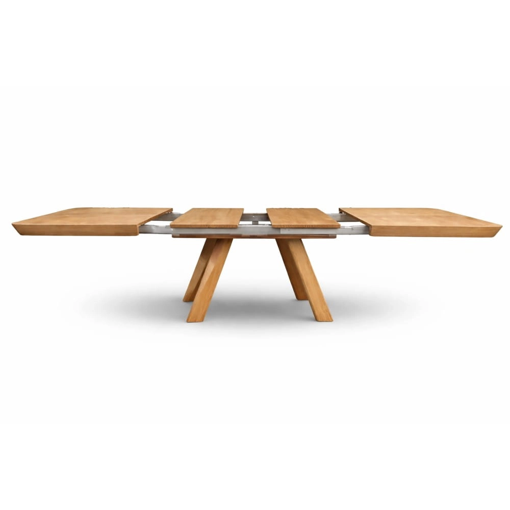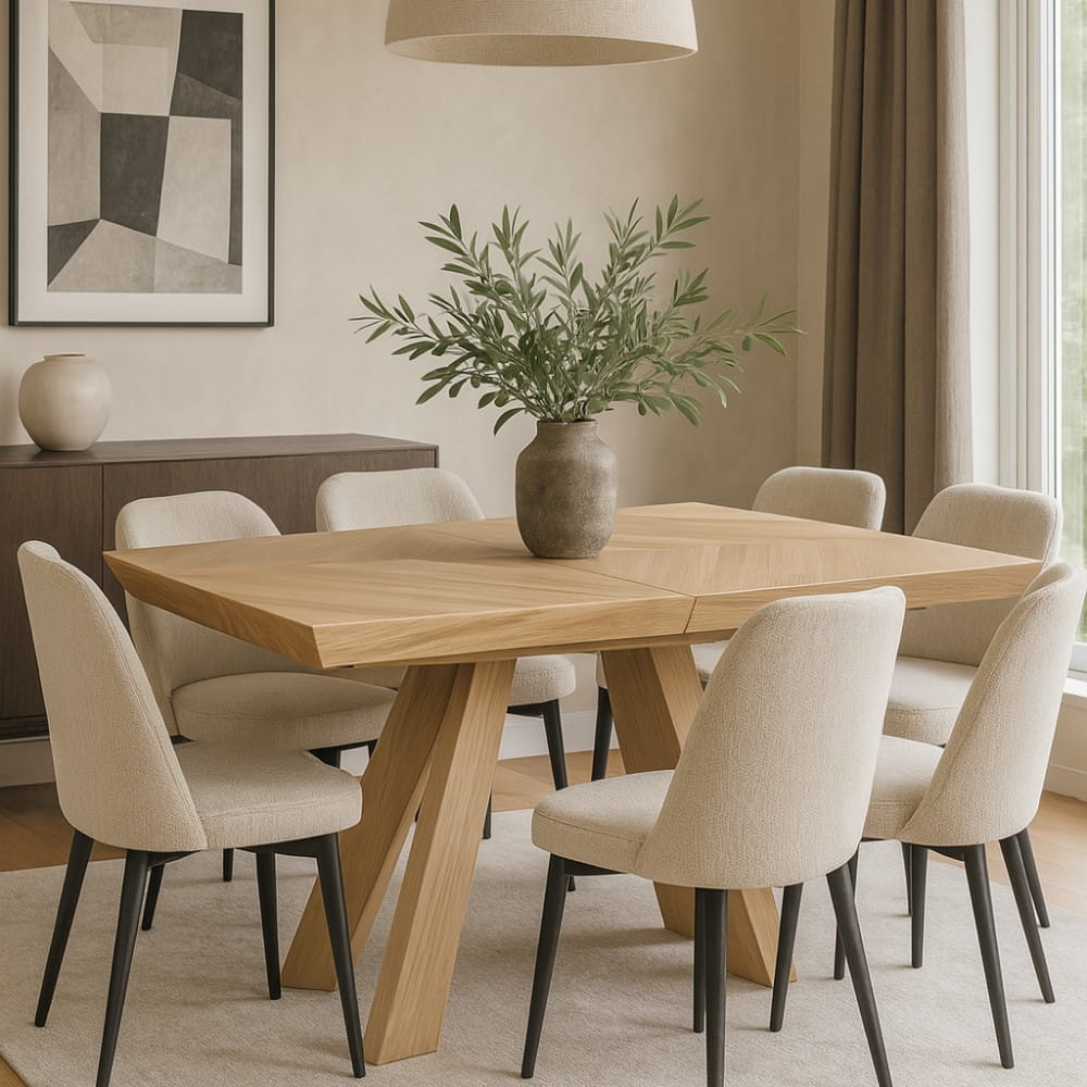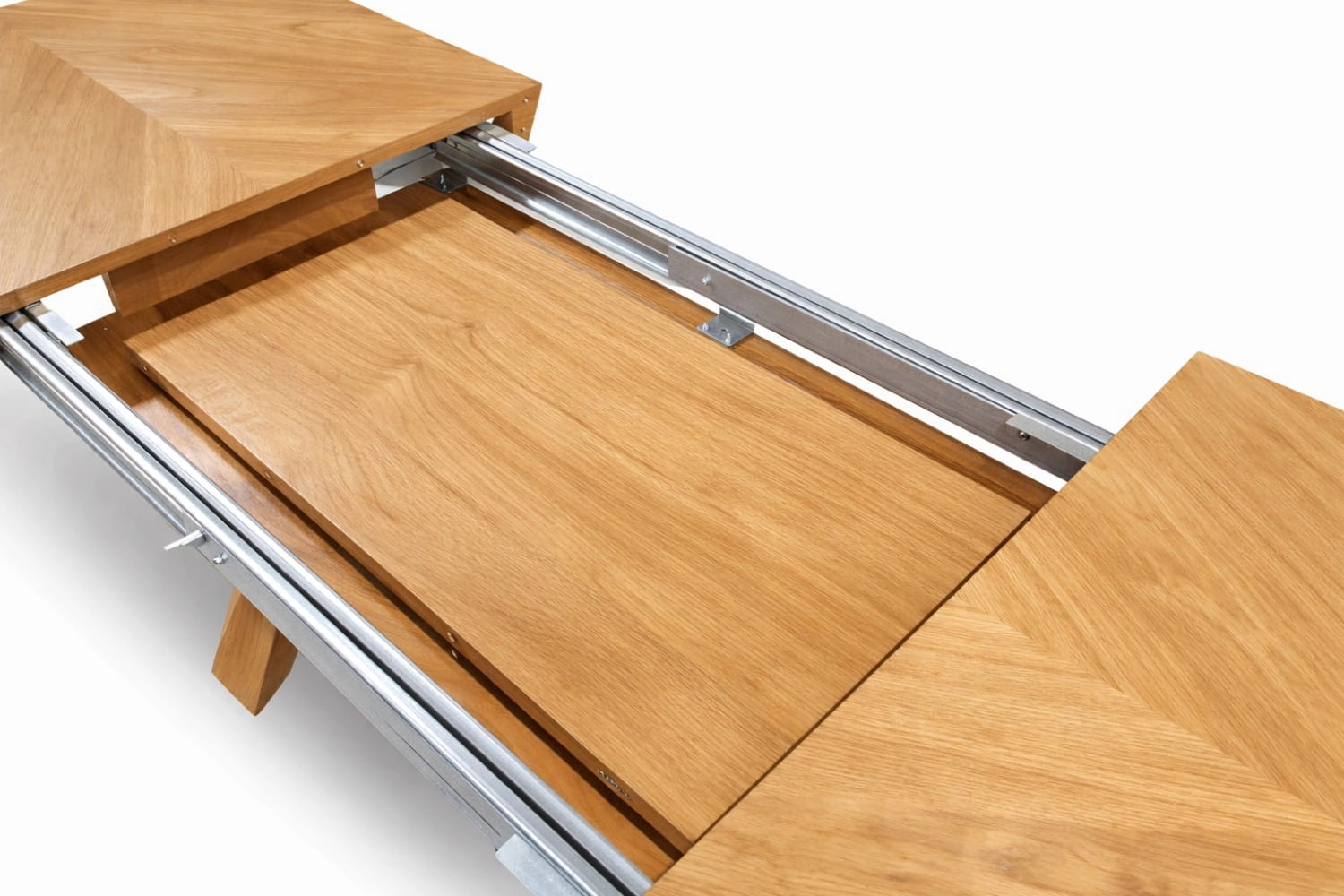 MILANO to duży stół rozkładany do jadalni, który łączy elegancki design z maksymalną funkcjonalnością. Blat z forniru dębowego w jodełce francuskiej oraz masywna podstawa z litego drewna tworzą mebel klasy premium.