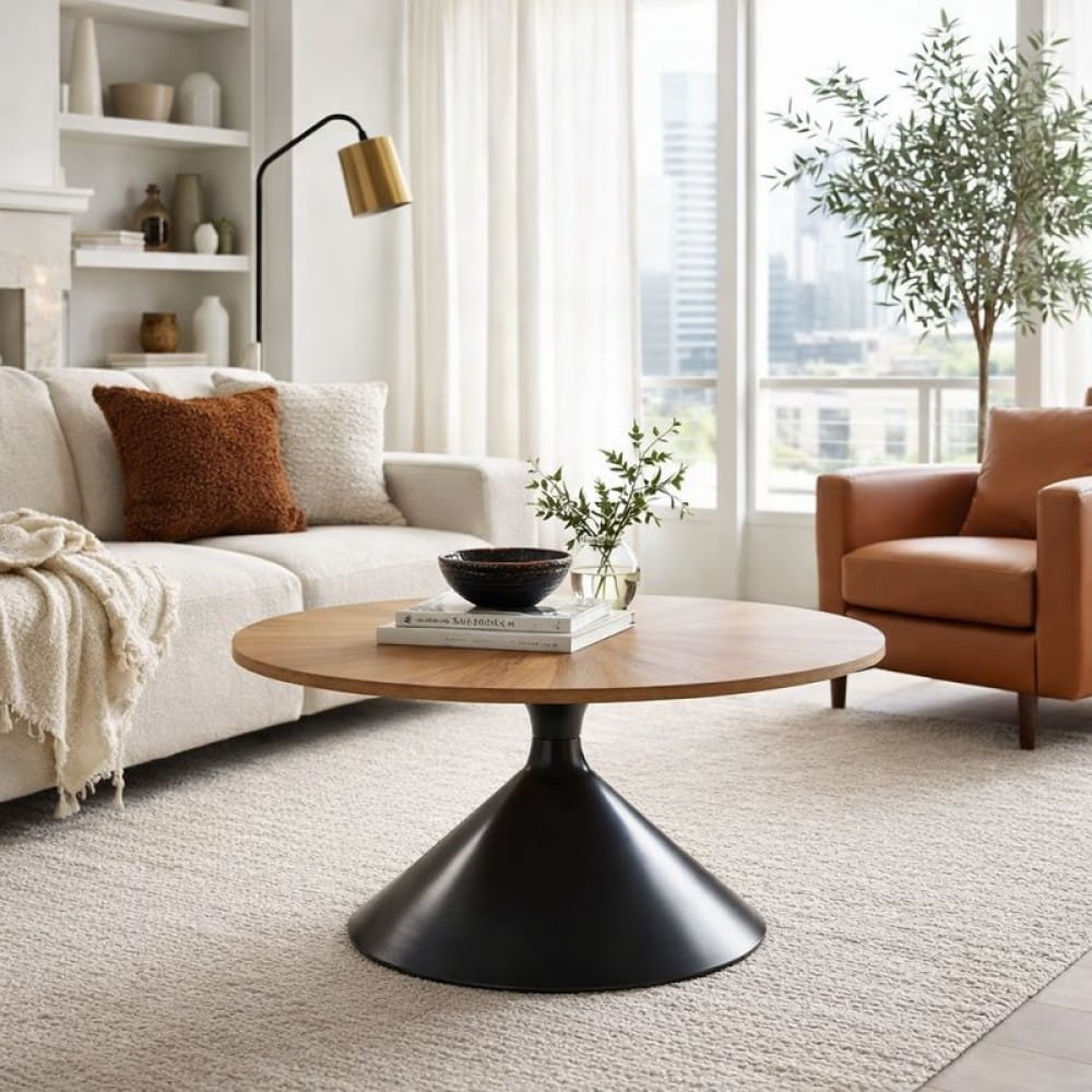 TULIA 70 to niski stolik kawowy o średnicy 70 cm, zaprojektowany jako centralny punkt strefy wypoczynkowej. Naturalny dekor drewna ociepla wnętrze, a czarna metalowa podstawa nadaje mu nowoczesnego charakteru.