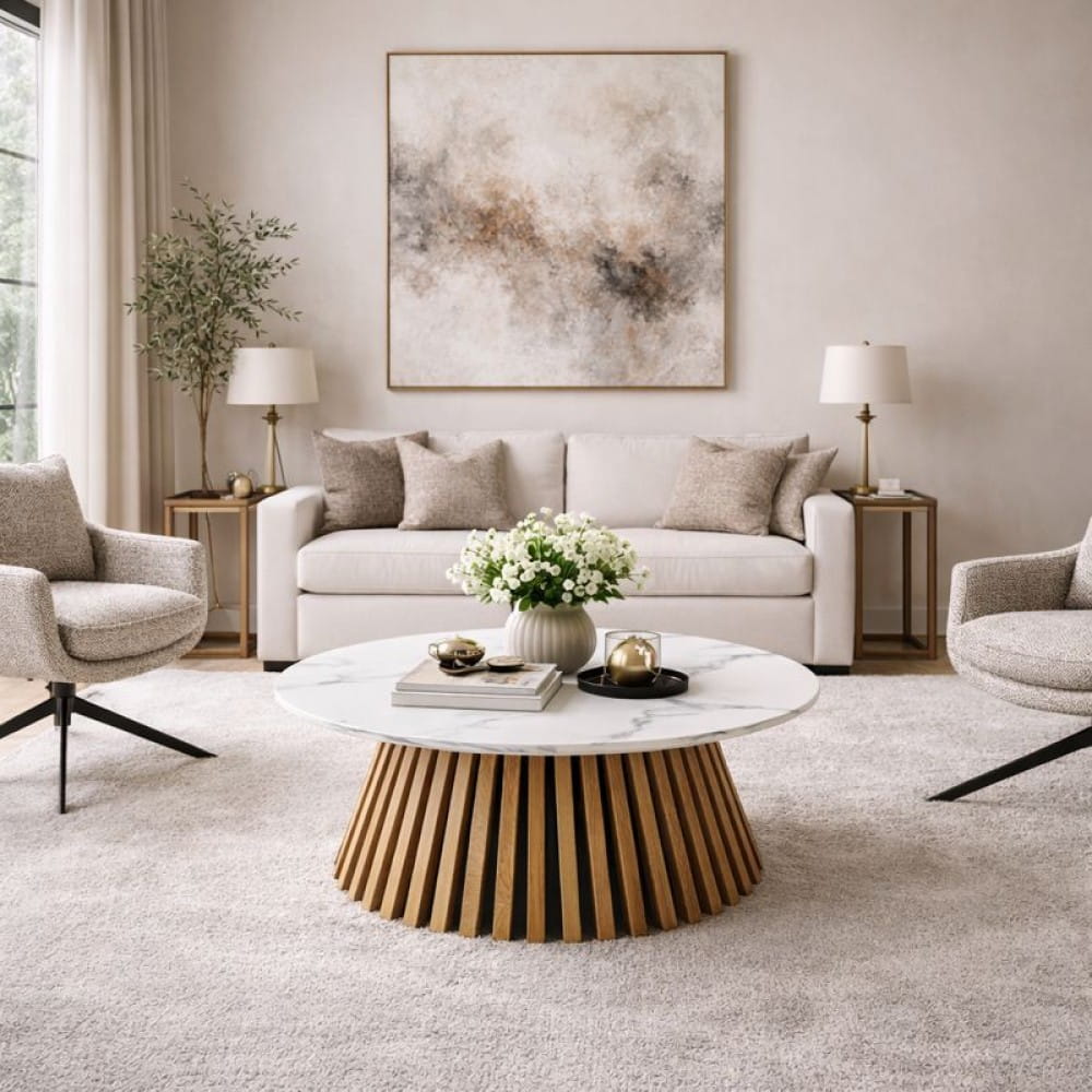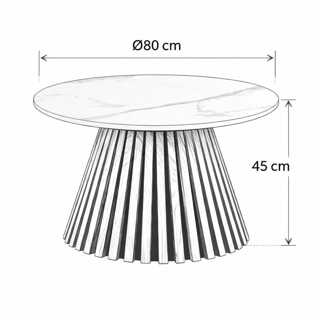 Stolik kawowy VALENTI to elegancki, okrągły model o średnicy 80 cm z blatem w imitacji białego marmuru oraz lamelową podstawą w kolorze dębu. Jasna kolorystyka i architektoniczna forma sprawiają, że doskonale pasuje do salonów w stylu modern classic, japandi i nowoczesnym.