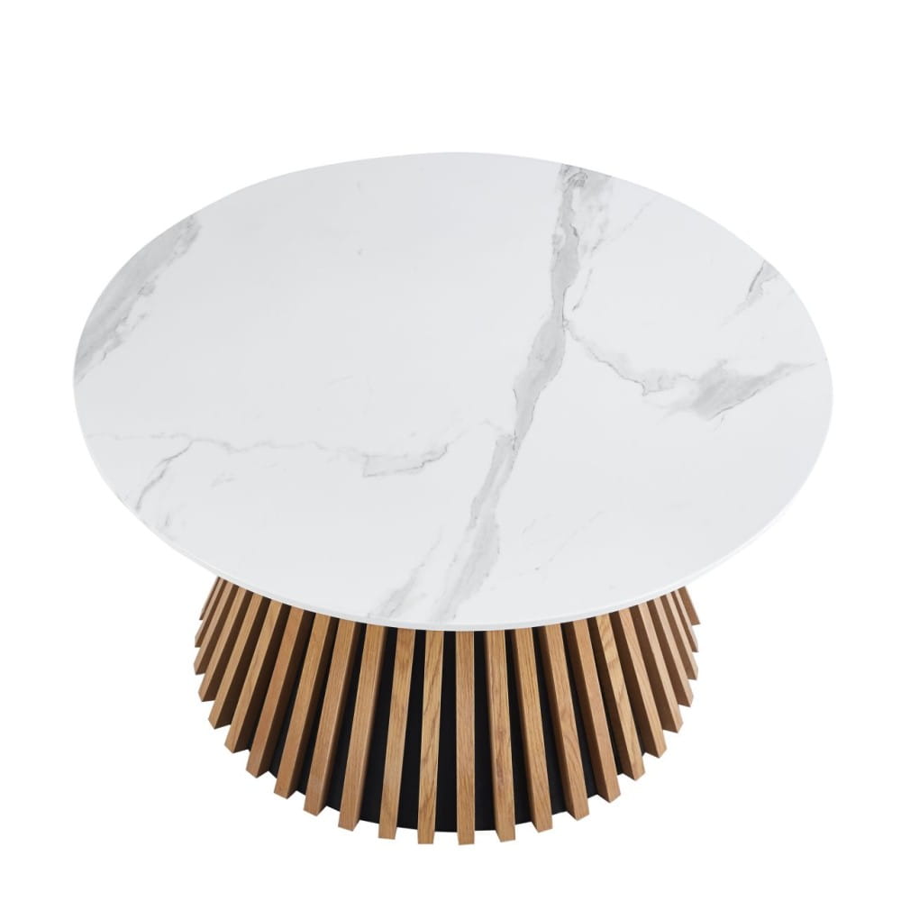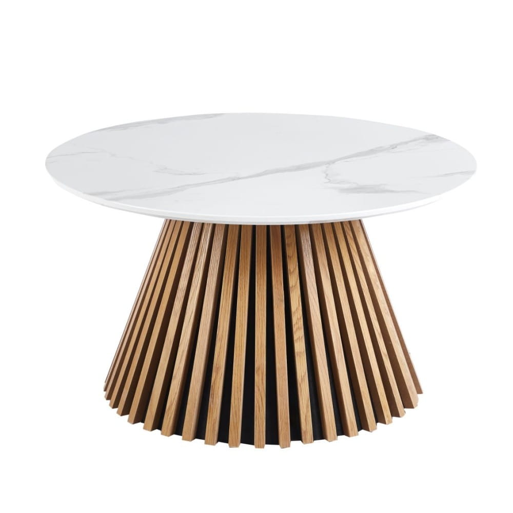 VALENTI – stolik kawowy z białym marmurem i lamelową podstawą