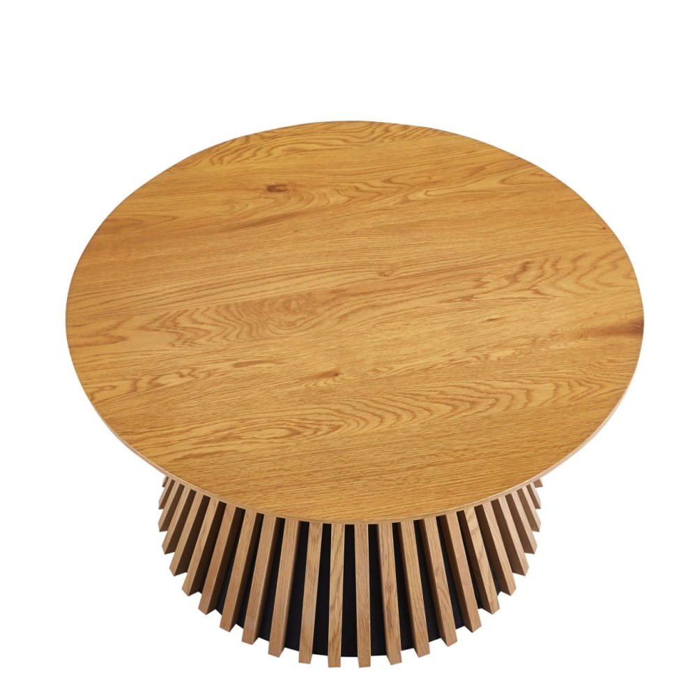 VALENTI to okrągły stolik kawowy o średnicy 80 cm, zaprojektowany z myślą o gotowych wnętrzach. Lamelowa podstawa nadaje mu wyrazisty, architektoniczny charakter, a ciepły odcień dębu doskonale wpisuje się w nowoczesne aranżacje.