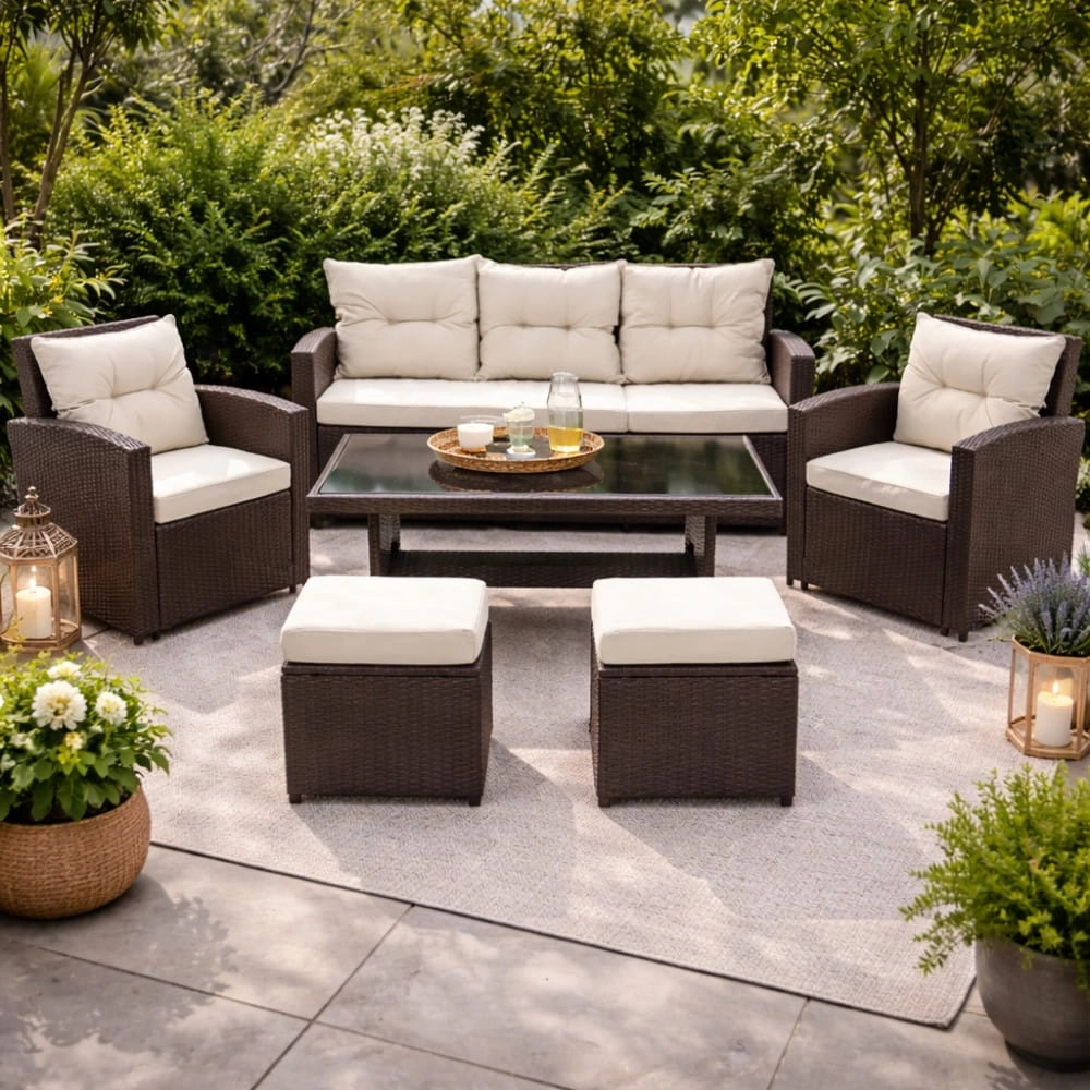 W zestawie znajduje się sofa 3-osobowa, dwa wygodne fotele, dwie pufy oraz duży stół. To idealne rozwiązanie zarówno do relaksu, jak i wspólnych posiłków na świeżym powietrzu.