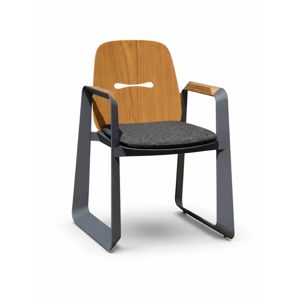 Krzesła wyposażone są w poduszki z pianki memory, które dopasowują się do sylwetki. Profilowane oparcie zapewnia ergonomiczne podparcie pleców, a podłokietniki z drewna teakowego zwiększają wygodę użytkowania.