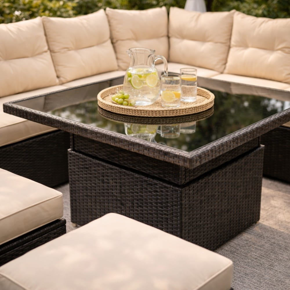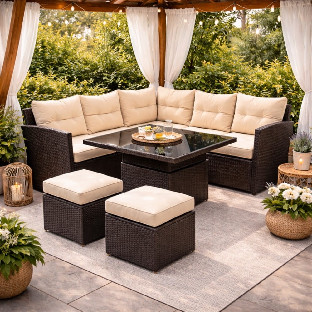 Zestaw ogrodowy TOSCANA CORNER w odcieniu brązu z kremowymi poduszkami tworzy wyjątkowo elegancką i przytulną przestrzeń wypoczynku na tarasie lub w ogrodzie. Narożnik, funkcjonalny stolik z regulacją wysokości oraz pufy pozwalają stworzyć komfortowe miejsce do relaksu i spotkań na świeżym powietrzu.