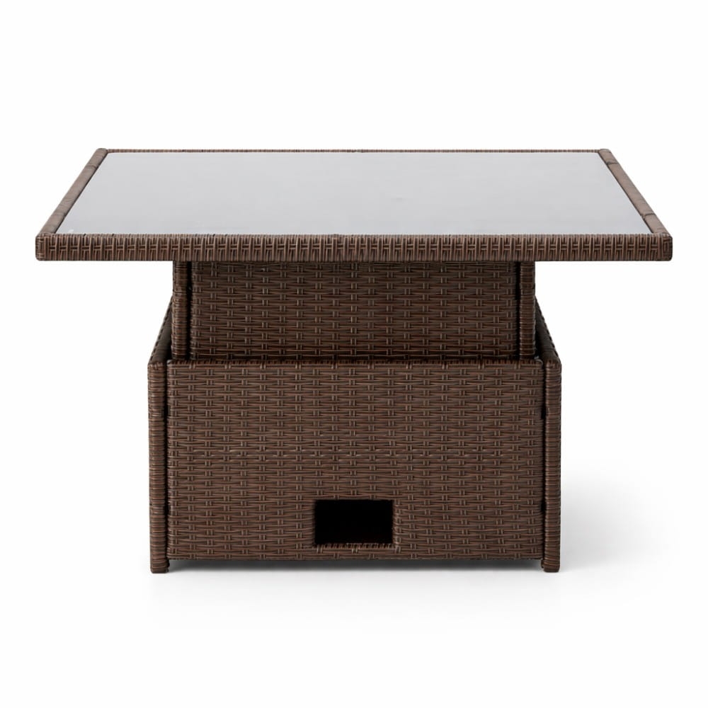 Konstrukcja malowana proszkowo zapewnia stabilność i odporność na warunki atmosferyczne. Rattan w kolorze brązowym jest trwały, elastyczny i łatwy w pielęgnacji.